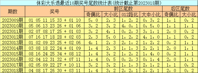 上期总结:体彩大乐透第2023018期开出号码:04 08 17 26 30 + 03 11,其中前区奖号余数奇偶比为1:4,大小比为3:2,012路比为2:2:1,大中小比为2:2:1,后区奖号余数奇偶比为2:0,大小比为0:2。