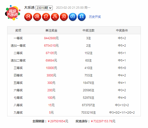 大乐透5+2两元单:01、07、08、18、25 + 01、04