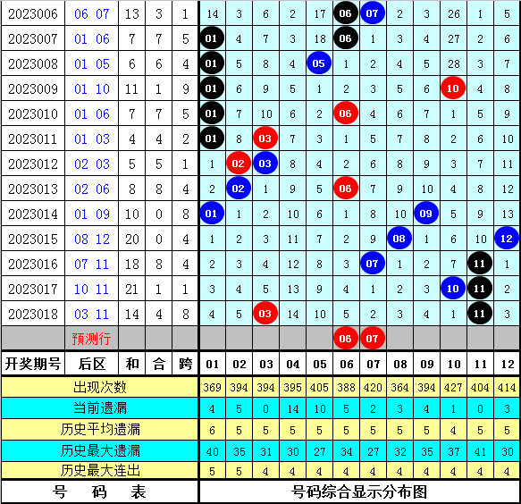 后区奇偶比2:0,后区大小比1:1,后区和值为14,后区跨度为8,与上期有1个同号:11。